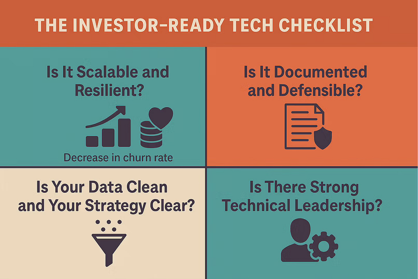 A brilliant but undocumented system is a major red flag. Investors want to see documented systems and architecture, with a clear, actionable technology roadmap that is tightly aligned with your business goals. At Absolute Collagen, a core part of Neil Bradley’s (Founder and Fractional CTO at Hanabi) role was developing and presenting the technology roadmap to the board and private equity investors. This demonstrates strategic foresight and reduces key-person dependency.